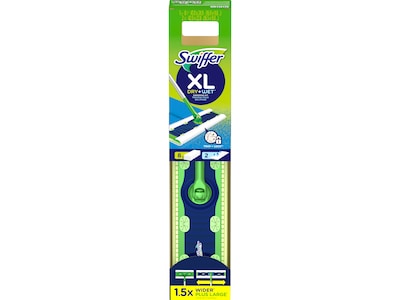 The Swiffer Sweeper XL Dry + Wet sweeping kit is a two-in-one multi-surface floor cleaner designed for both sweeping and mopping. Enjoy the convenient combination of a broom and mop for a quick and easy clean that gets the dirt out of your home once and for all, no dustpan or bucket required! The TRAP + LOCK dry sweeping cloths deal with dirt, dust, and hair, while the wet mopping cloths easily cut through grime. The Swiffer Sweeper XL is 1.5 times wider than the regular Swiffer Sweeper, so you can tackle larger areas.