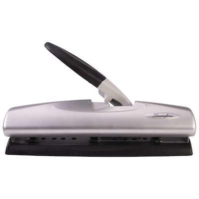 Wide, soft lever handle on this Swingline reduced-effort punch cleanly cuts holes through 20 sheets at a time. The desktop punch's manual operation is simplified by the low-force design that requires 50% less punching effort. Also includes semi-adjustable centers to accept up to 7 punch heads to deliver between 2 to 7 holes. Spill-resistant chip tray and lock-down handle make cleanup and storage easy.