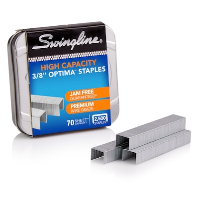 Swingline® Optima™ High Capacity Staples are specifically made for use with Optima® 60- and 70-sheet capacity staplers. These staples feature stronger wire for easier piercing and less jamming even at high sheet counts. The longer 3/8" leg length holds large paper stacks securely. 125 staples per strip, 2,500 staples in a reusable storage box.