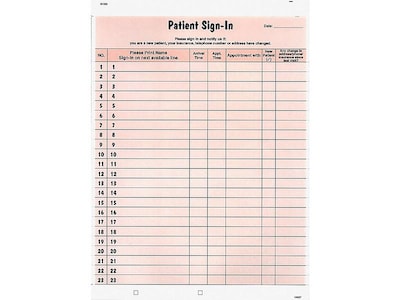 Place these sign-in sheets at the front desk of any doctor's office to ensure that patients are seen in the order that they arrive. Once labels are removed, a hidden sheet retains patient information for confidential records. This pack contains 125 Tabbies patient sign-in label forms, which each has numbered label strips for 23 patients.