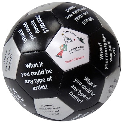 More than a ball! Throw it! Catch it! Respond to the panel under your thumb. Measures 6". What If? Version talks about hypothetical "What if's" that you must answer. Can be played in a small or large group. For ages 5+.
