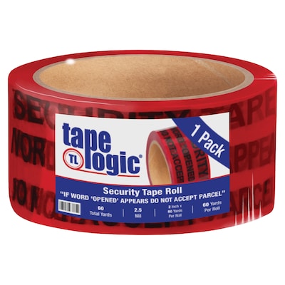 Tape Logic Red secure tape measures 60 yds length by 2" width. Tape has a thickness of 2.5 mil.