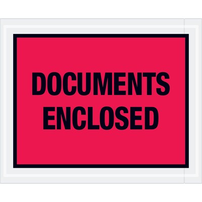 4 1/2 x 5 1/2" Red "Documents Enclosed" Envelopes. Pressure sensitive envelopes secure and protect documents that are attached to the outside of shipments. Pre-printed with specialty use messages on heavy 2 Mil poly. Hot melt adhesive backing provides strong adhesion to paper and corrugated products. Envelopes open along the first dimension.