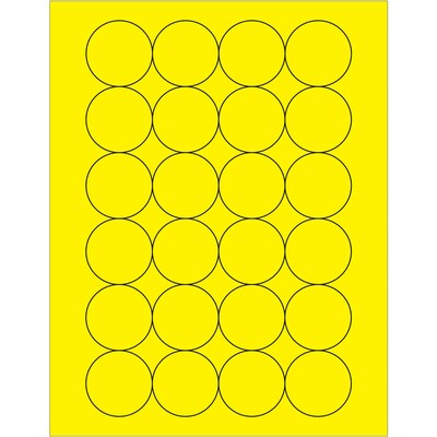 Use to create your own product or mailing labels. 1 2/3" Fluorescent Yellow Circle Laser Labels. Use to create your own product or mailing labels. Labels work with both laser and ink jet printers. Permanent adhesive. Labels stick to a variety of smooth surfaces including paper, corrugated, plastic, wood, glass and metal.