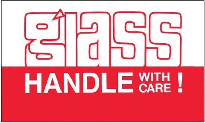 Tape Logic™ "Glass - Handle With Care !" Shipping label measuring 3" x 5" attracts attention by boldly displaying instructions as well as warnings. Label is pressure sensitive for firm adhesion, sold as 500 per roll.
