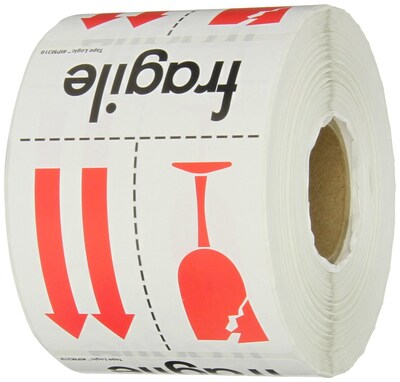 Tape Logic™ "Fragile" Shipping label measuring 3" x 4" attracts attention by boldly displaying instructions as well as warnings. Label with picture of glass and arrows is pressure sensitive for firm adhesion, sold as 500 per roll.