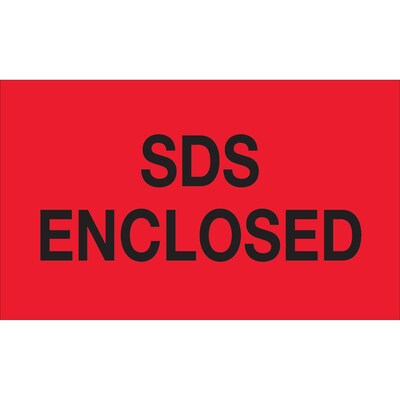 3 x 5" - "SDS Enclosed" (Fluorescent Red) Labels. Boldly display instructions and warnings with pressure sensitive labels. Table top dispensers available stock numbers SL9506, SL9512 and SL9518. Wall Mount dispensers available stock numbers LDM300, LDM450, LDM850 and LDM1250. 500 per roll.