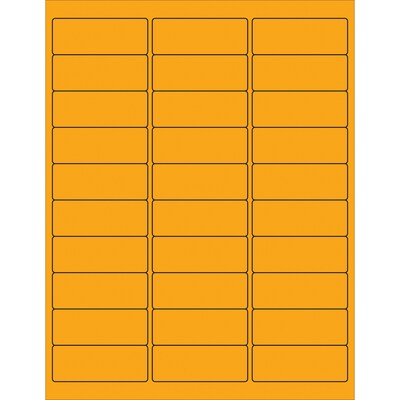2 5/8" x 1" Fluorescent Orange Rectangle Laser Labels. Use to create your own product or mailing labels. Labels work with both Laser and ink jet printers. Permanent adhesive. Labels stick to a variety of smooth surfaces including paper, corrugated, plastic, wood, glass and metal.