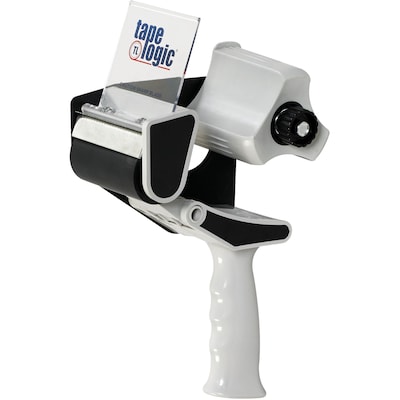 Tape Logic 3" Top Gun Carton Sealing Tape Dispenser. Natural rubber roller and heat-treated blades provide smooth tape release. Features a reinforced steel frame with a high impact, plastic, tension control knob and a plastic loading gate.