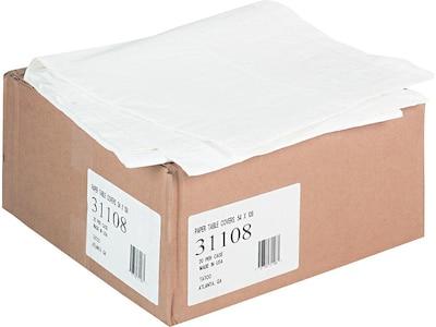 Protect tabletops from spills and other damage by covering them with these rectangular paper table covers. The bright white color offers a clean appearance, while the large size lets these covers fit tables up to 8 feet long. These Tatco white paper table covers come in a pack of 20 units and boast three-ply construction to provide the durability needed to prevent rips and tears.