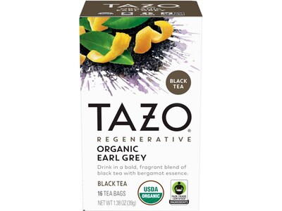 The Tazo regenerative organic Earl Grey tea is an aromatic black tea blended with bergamot essence named after it was given as a gift to a British nobleman.