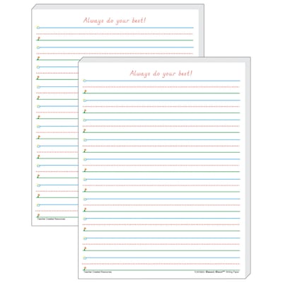 Smart Start Writing Paper (8-1/2" x 11") is truly a "Smart Start" for beginning and experienced writers. Bold graphics in blue, green, and red promote the feeling of success as children simply "Start at the Sky and pull down to the Ground" to form letters correctly. 1-2 Writing Paper lines have 5/8" spacing. Each pack includes 100 sheets. Sold as 2 packs for a total of 200 sheets.