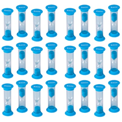 Race to see how much can be accomplished before time runs out. Great for games, timed tests, and time management. Handy plastic timers with colored sand. Includes suggested activities. Timers measure 1" x 2.5". Each pack includes 4 two-minute timers. Sold as 6 packs for a total of 24 timers.