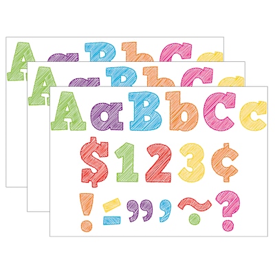 Use these letters to create bulletin boards, classroom centers, signs, banners, and other displays. They punch out easily and are coated for durability. The colors and designs coordinate with popular decorative products. Each pack includes 230 total pieces: 61 uppercase letters, 95 lowercase letters, 20 numbers 0 to 9, 40 punctuation marks, and 14 Spanish accent marks. Sold as 3 packs for 690 characters total.