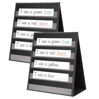 This sturdy self-standing and double-sided desktop pocket chart is built for extra rigidity and strength. It features five transparent pockets per side for use with dry-erase strips (included), index cards, sentence strips, word cards, photos, and more. The chart has a built-in clear storage pocket, folds flat for easy storage, and measures a compact 15-1/2" x 12" x 7-1/2", making it ideal for home or small-group instruction. Each set includes one (1) pocket chart and twenty (20) double-sided dry-erase strips. Sold as a pack of 2 complete sets.