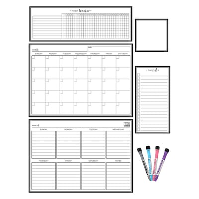 Keep track of important dates, activities, and tasks with this write-on/wipe-off dry-erase magnetic calendar set. Organize your busy schedule by filling in the monthly and weekly calendar charts. Use the habit tracker to stay on top of daily routines like exercising and practicing a skill. For notes and reminders, use the list or the square note to keep track of what you need or quickly get your point across. Use on refrigerators, whiteboards, lockers, metal desks, metal shelves and more. Includes 4 dry-erase pens in black, blue, pink, and purple. This set includes 17" x 12" monthly calendar, 17" x 12" weekly calendar, 16.75" x 5.75" habit tracker, 5.75" x 11" list, and 5.425" x 5.425" square note.