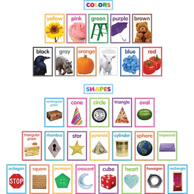 Reinforce color and shape recognition with this colorful bulletin board display. Each card includes a photo to help students make real world connections. Includes 20 shape cards (13 two-dimensional shapes and 7 three-dimensional shapes), 11 color cards, a "Shapes" header, a "Colors" header, plus a set up guide with suggested activities. Each card measures 5-3/4" x 8-1/2". 33 total pieces.