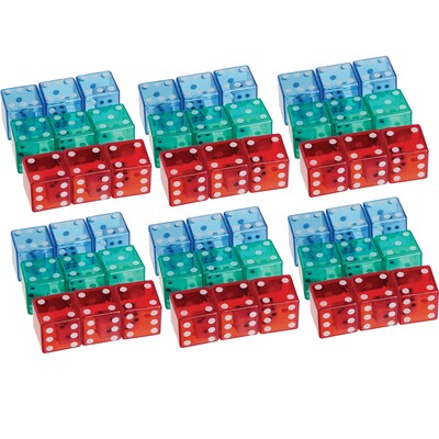 Learn about place value, math operations, and probability. Comes in a resealable storage bag. Teaching tips are included. Each set includes nine 1" dice: 3 red, 3 green, and 3 blue each with a white die inside. Sold as 6 sets for a total of 54 dice.