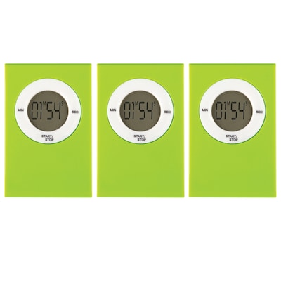 The digital timer is a countdown timer and stopwatch in one. Great for math exercises, science experiments, timed tests, games, classroom management, and more! Includes one AG13 button-cell battery. Sticks to whiteboards or any magnetically receptive surface. Measures approximately 2-1/8" x 3-3/8" x 1/4". Sold as a pack of 3 timers.