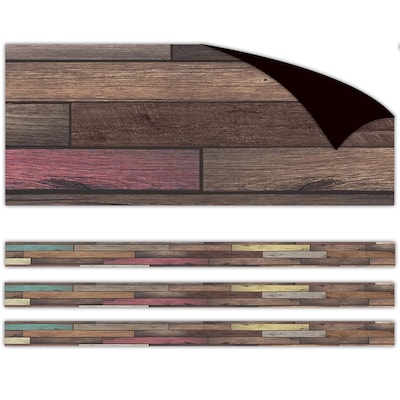 Decorate your whiteboard in a snap with durable, reusable magnetic decor! This Reclaimed Wood Magnetic Border adds flair on other metal surface such as doors, desks, shelving, and bins. Cuts easily with scissors to make your own labels or game pieces. Each magnetic border is 24" x 1½". Each pack contains 12 strips for 24 feet. Sold as 3 packs for a total of 36 strips (72 feet).