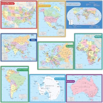 Convenient, useful learning tools that decorate as they educate! Each chart measures 17" by 22". Related lessons and activities are provided on the back of every chart. This product is acid-free per industry standards. This set includes 9 different Map Charts: Antarctica, Asia, Australia, Europe, US Map, World Map, Africa, North America, South America.