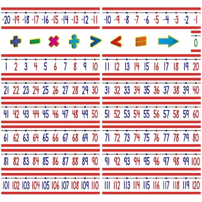 Teacher Created Resources Number line -20 - +120 bulletin board display set measuring 23" x 5" is versatile to guide math operations. Set include 15 number line pieces, 8 accents and a teacher's guide.