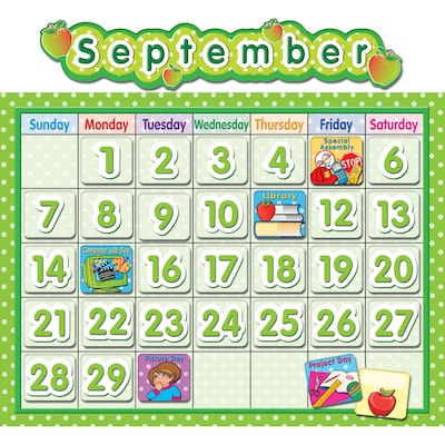 Inspire smiles every day with a polka dot calendar. This bulletin board includes a blank calendar, easy-to-read numbers pieces, colorful monthly headers, and additional pieces for holidays and special occasions.The holiday pieces are: Valentine's Day, Thanksgiving, St. Patrick's Day and President's Day. The special occasion pieces: 100th Day, Computer Lab Day, Early Dismissal, Field Trip, Happy Birthday, Library, No School, Open House, Picture Day, Project Day, Recognition Day, Special Assembly, Spring Break, Testing Day and Winter Break. Plus three blank cards that you can customize. The blank calendar measures 24" x 18". Includes over 65 pieces! All pieces are UV coated for durability.