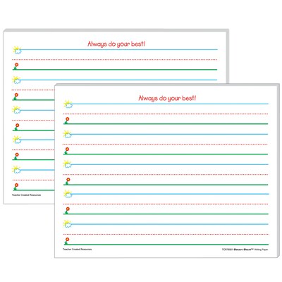 Smart Start Writing Paper (11" x 8-1/2") is truly a "Smart Start" for beginning and experienced writers. Bold graphics in blue, green, and red promote the feeling of success as children simply "Start at the Sky and pull down to the Ground" to form letters correctly. K-1 Writing Paper lines have 1" spacing. Each package includes 100 sheets. Sold as 2 packs for a total of 200 sheets.