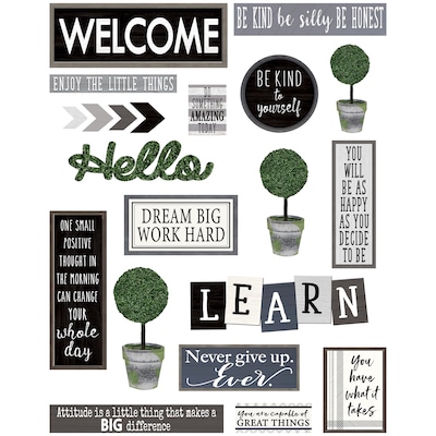 The dark wood, black, white, and gray color combinations, as well as the sleek text and designs, make this wall décor bulletin board set a fresh addition to any classroom. Use each piece separately around the room, or put them all together to create the perfect gallery wall. Welcome piece measures 23" x 8-1/4". 21 total pieces.Set includes:• 1 "Welcome" sign• 1 "Learn" sign and 1 "Hello" sign• 11 signs with positive messages• 3 boxwood topiary trees and 4 chevron arrow accents• Bulletin board guide with set up and activity suggestions• Shiny protective coating for durability
