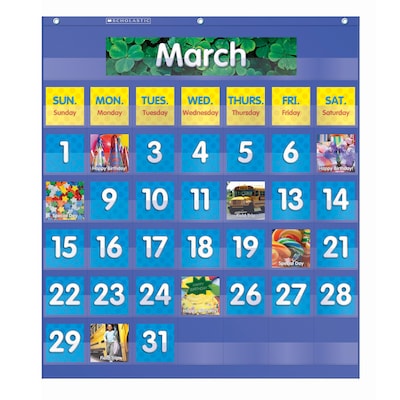 Teacher's Friend® Monthly calendar pocket chart for grades K - 5 features full color photo cards and help teacher to organize a classroom. Nylon chart in blue color includes date cards/4 birthdays/2 field trips/12 month cards and activity guide.