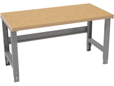 - Medium gray hardwood butcher block top workbench with steel adjustable legs