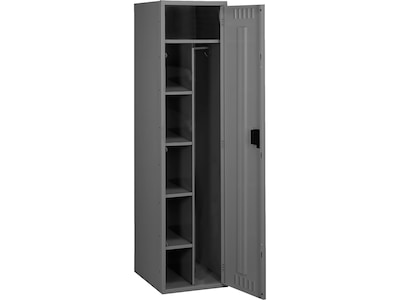 - Single unit in light gray with seven compartments; features coat hooks and coat rod