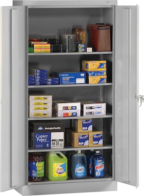 Standard-size storage cabinet features premium-quality steel throughout for maximum rigidity. Dual swing-out, reinforced doors ride on heavy-duty leaf-hinges. Three-point locking system ensures secure storage for bulky materials. Simply turn the polished chrome handle and doors lock at three points for maximum security. Nylon guides help make operation quiet. Cabinet base offers a "box" construction technique to prevent racking. Punched lances in back facilitate ventilation. Raised base keeps contents out of harm's way from cleaning liquids. Storage cabinet also includes four adjustable steel shelves that you can move in 2" increments without tools. Each shelf holds up to 150 lb. Cabinet comes with two keys.
