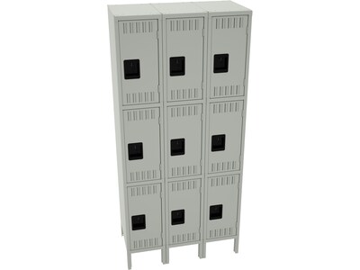 This Tennsco triple-tier locker is great for health clubs, gymnasiums, and other applications where ample storage must be balanced with space savings. This assembled unit fits three times as many lockers in the space of a single-tier locker. The three-wide unit comes welded with four rear legs for support. Each opening features flush louvers for ventilation and includes three coat hooks.