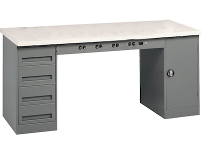 - Workbench with one drawer unit and cabinet is designed for electronic assembly, testing, product development, and other uses where access to multiple power outlets is important