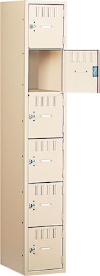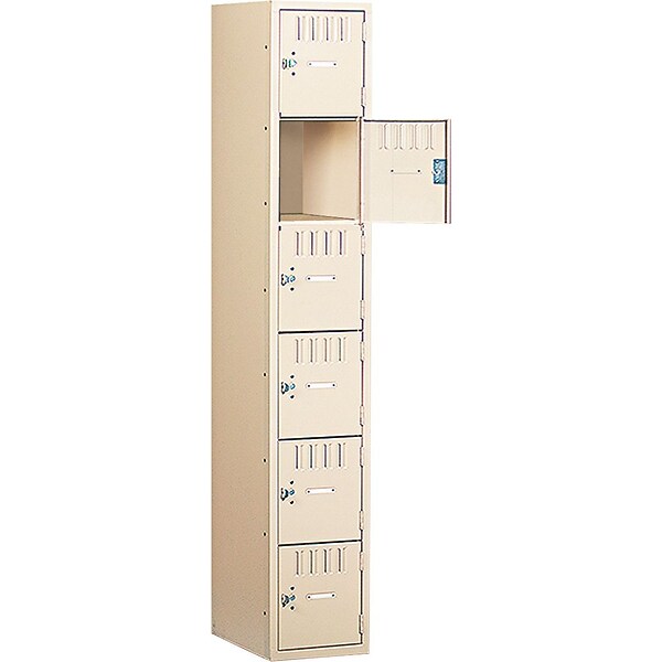 Tennsco™ Six tier single unit box locker with a sand finish has vertical louvers on each door that provide ventilation. Locker with a 12" x 12" x 18" compartment has 6 lockers and contains padlock hasps with tamper resistant hinges.