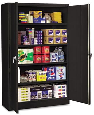 Tennsco Assembled jumbo storage cabinet measuring 78" x 48" x 18" has two shelves/doors and comes with integrated levelers. Steel cabinet offers 13 cu.ft of storage space and features sturdy box-formed construction for durability.