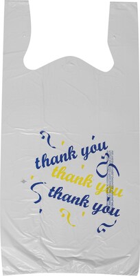 Pre-printed white T-shirt bags with a blue and yellow "Thank You" print.