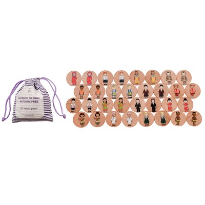 • This wooden matching game features vibrant illustrations of children from diverse cultures and traditions. Illustrations are on one side for memory games.