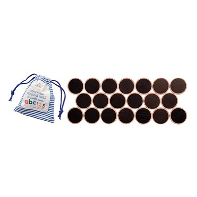 These 20 versatile Beech wood disks are limited only by the imagination! One side of each disk contains a large black circle that is ready to be drawn or written on with chalk. Create matching and memory games using letters, shapes and numbers, use them as collectible rewards for chores or create subitized patterns on them to help with subitizing skills… the possibilities are endless. Each disk measures 1.9" in diameter and 0.1" thick. For ages 2+.