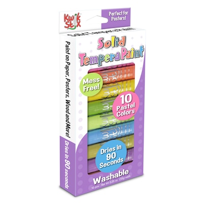 The softer side of Kwik Stix Solid Tempera Paint, 10 all new pastel shades! No cups, smocks, water or brushes needed. Great on poster paper, cardboard, wood and canvas - and MORE! Enjoy the same fast, 90 second dry time formula you love in this new pastel rainbow.