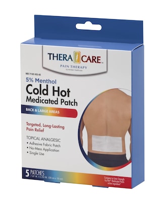 Soothing menthol gel patches offers relief where you need it most – back, arms, shoulders, legs or knees – without the mess of creams or ointments. Easy to apply, these TheraCare Cold Hot Medicated Patches can be used for up to 8-hours. Includes: five (7.87” x 3.93”) patches in resealable pouch with detailed instructions and warnings. Dedicated Customer Care Help Line for end-user product inquiries.