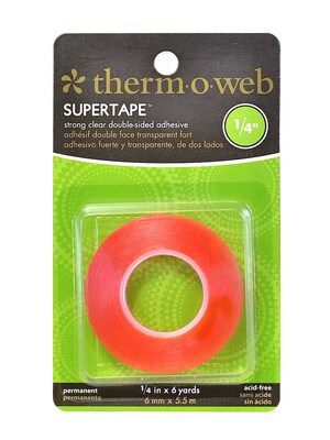 Super Tape permanent double-sided adhesive is extremely strong and bonds instantly. Great for adhering glitter, beads, and other embellishments that don't normally adhere well with traditional glue. Available in rolls of varying width and a sheet size.