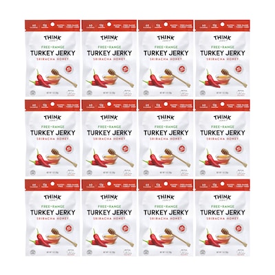 • A 12-Pouch pack of Think Jerky Sriracha Honey flavored Free-Range Turkey Jerky