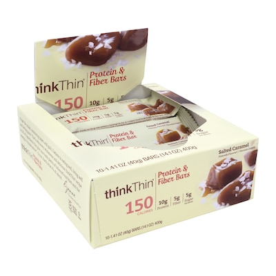 - A 10 bar box of thinkThin Protein Bars in Salted Caramel flavor