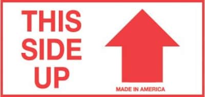 "This Side Up" Shipping label in white/red color measuring 2" x 4" displays instructions boldly that attract attention, sold as 500 per roll.