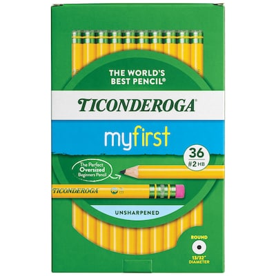 Ticonderoga My First Pencils have a large size diameter (13/32") which is ideal for children in the early stages of their writing development. The exclusive #2 graphite formula provides extra smooth performance. These pencils are made with premium wood from responsibly managed forest. The pencils are PMA Certified and non-toxic. The erasers are latex-free and erase cleanly without leaving smudges or tearing the paper. Each pack includes 36 pencils with erasers.