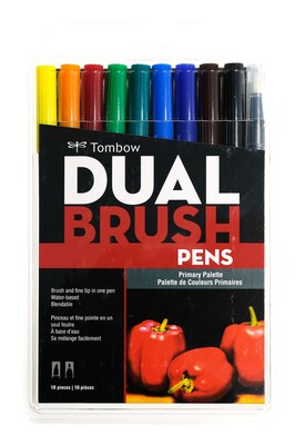 The convenience of a flexible brush and a fine tip in one pen. High-quality, resilient brush retains its point stroke after stroke. Nontoxic, acid-free, odorless, and easily blendable. Ideal for fine arts and crafts.Set of 10 "Primary" includes: black, c