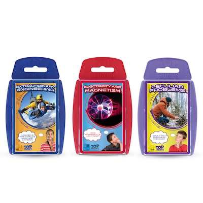 TOP TRUMPS is not just an action-packed, competitive card game - it's also all about the world we inhabit. In this brand new bundle of three of our very best TOP TRUMPS packs, you can discover a treasure trove of facts and figures about scientific concepts and research, incredible feats of engineering and math, and some of the electrical and magnetic concepts that define life on Earth and beyond. In Peculiar Problems, answer some of the most unusual questions we can think of: how does the moon affect the ocean, and how do you beat the speed of sound? Extraordinary Engineering will have you battling to find out which everyday items, like refrigerators, cable cars and the internet, have had the most impact on modern life. Then explore some of the most crucial scientific concepts, like renewable energy, radiation and the Northern Lights. Choose your best stat from each card to win, and claim the title of Top Trump. This bundle is crammed full of games that will entertain and educate, and is guaranteed to satisfy even the most curious minds.