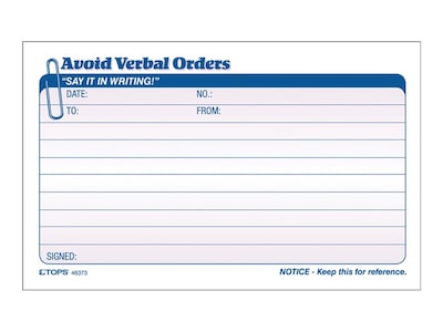 Make directions, assignments, and orders clear with this TOPS avoid verbal orders carbonless manifold book.